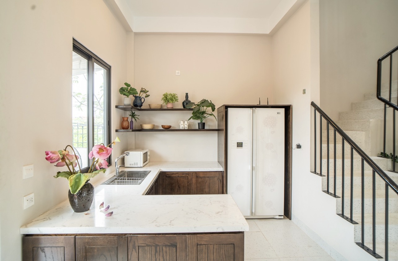 – Khu bếp đầy đủ: dụng cụ nấu ăn, bát đũa, xoong nồi, tủ lạnh (side by side), lò vi sóng, bình siêu tốc.