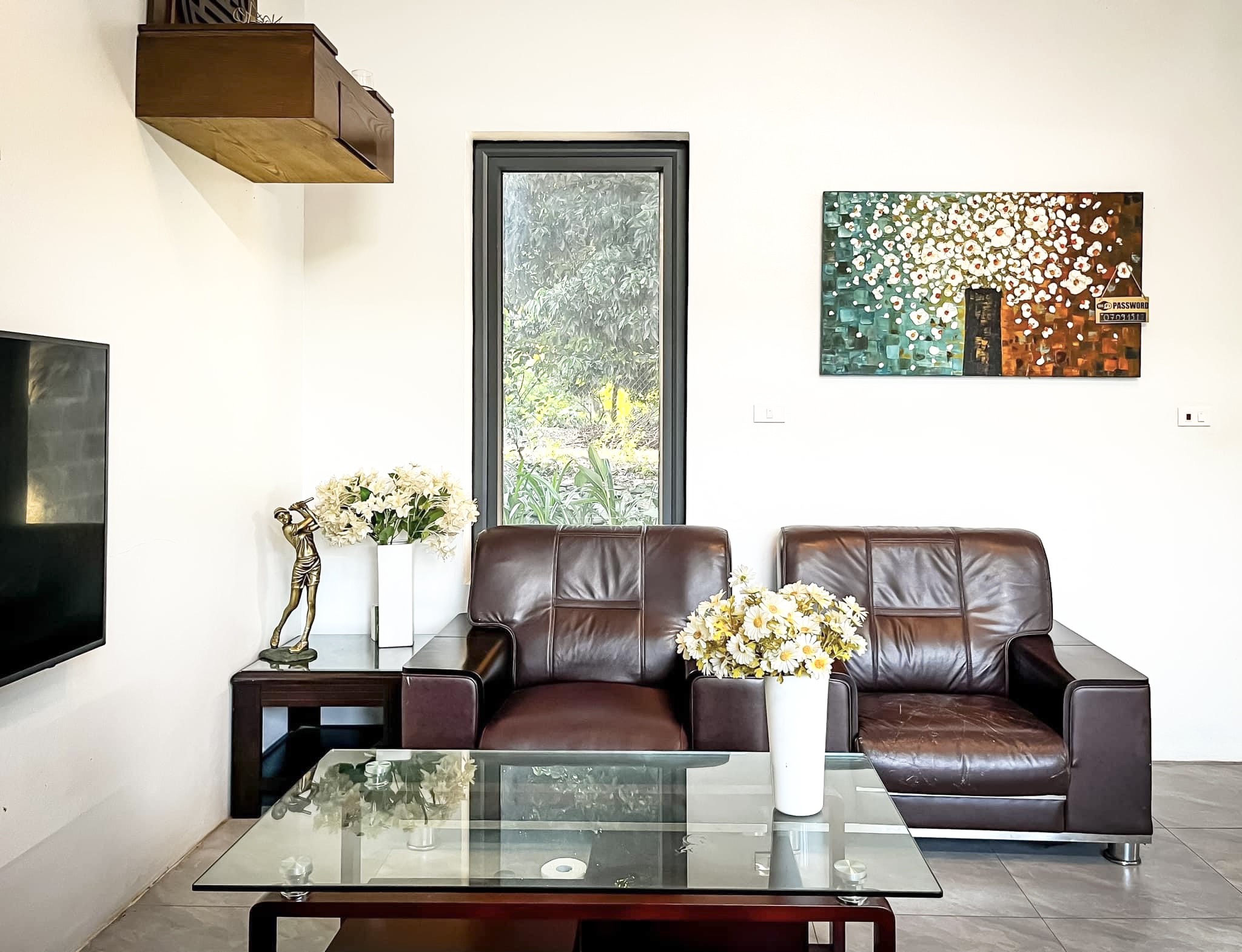 Phòng khách gồm bàn ghế sofa + tivi + 2 sofa giường, 2 giường gấp, 2 đệm 1,6 m.